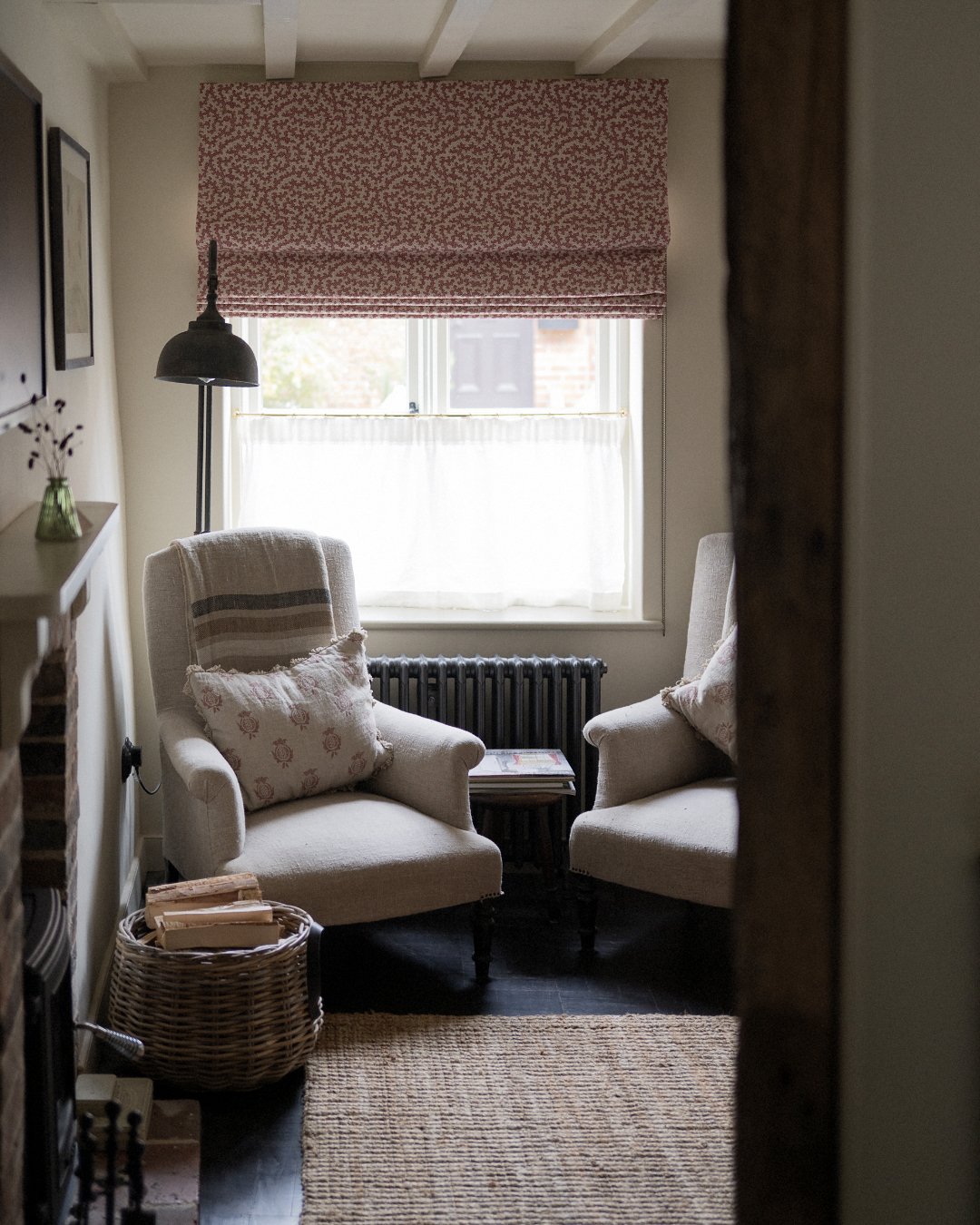 As we had originally intended to just have the cafe curtains, we had a rethink and consulted Diana Kelly Interiors, whose lovely shop is a stone’s thrown from us and right in the centre of Alfriston village. The result is as you see in the image below and a special mention to Ann Clark Curtains who did a fantastic job in the making and fitting of these roman blinds.